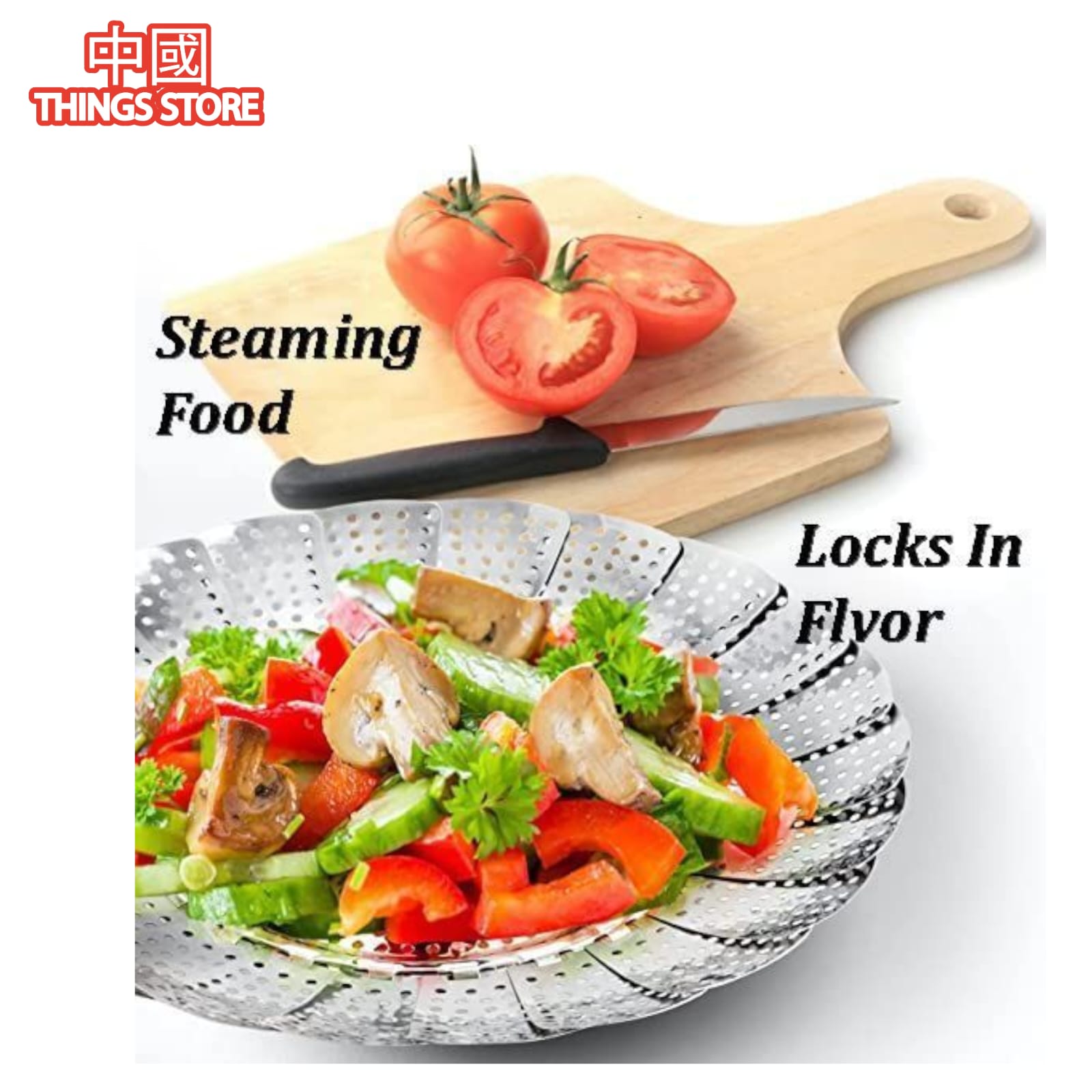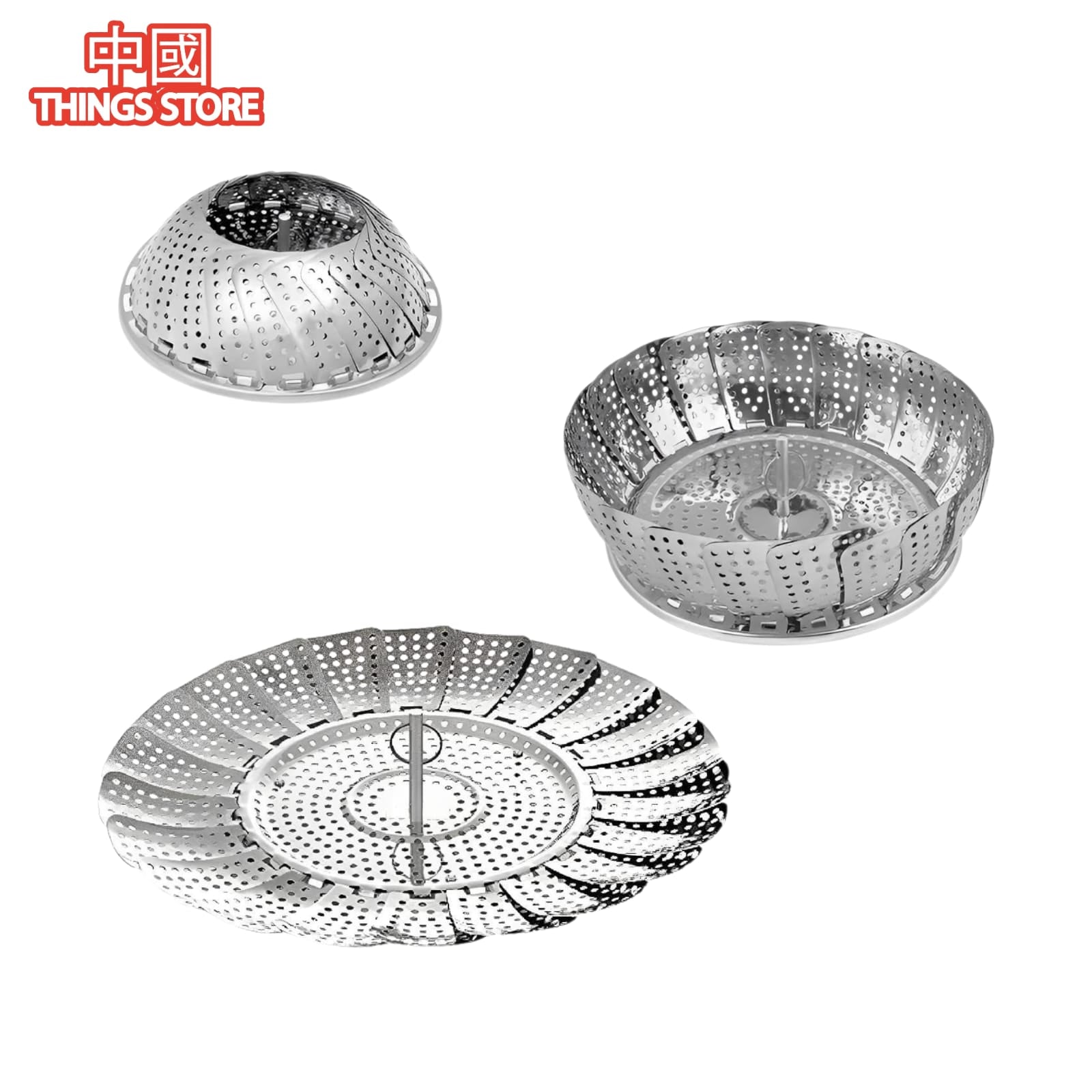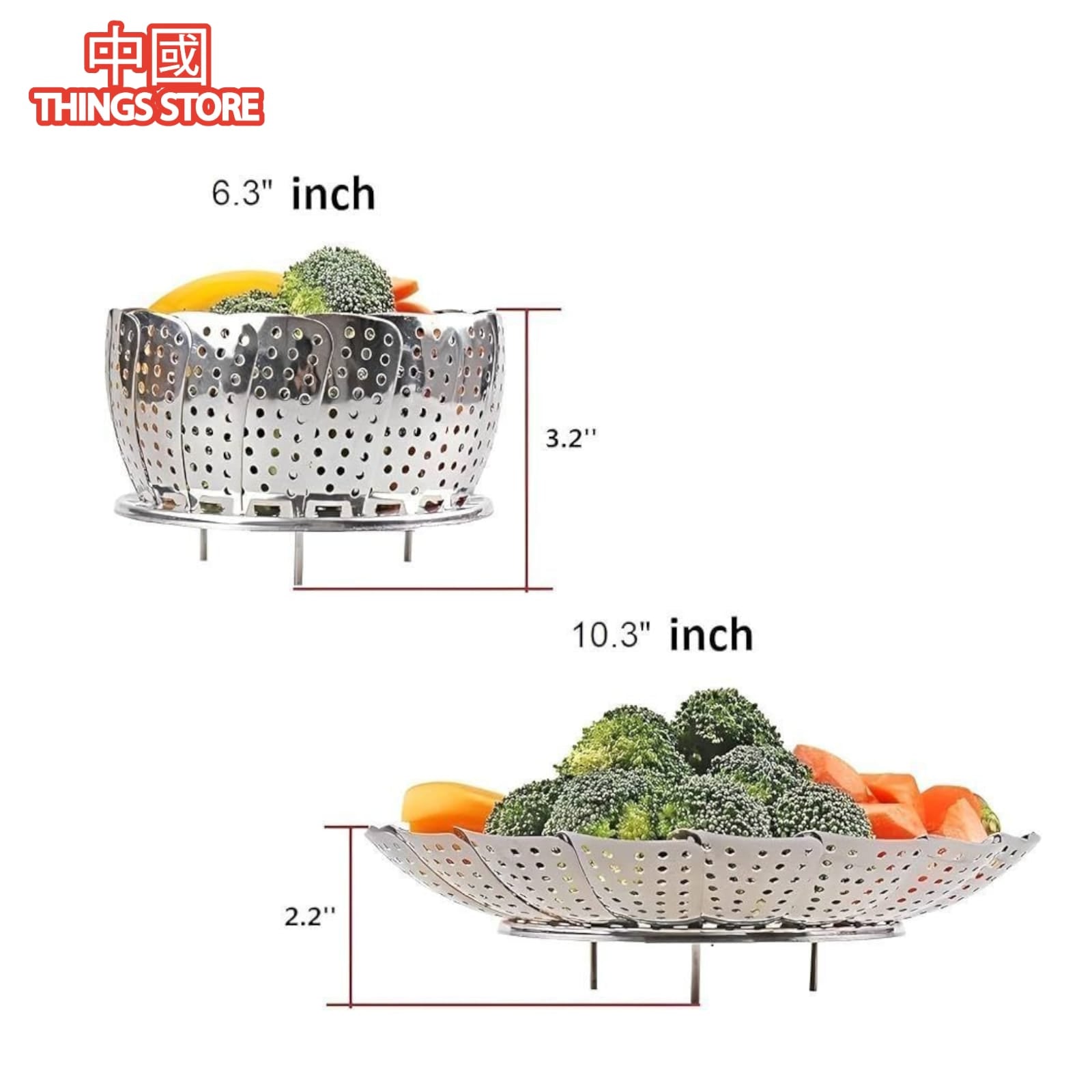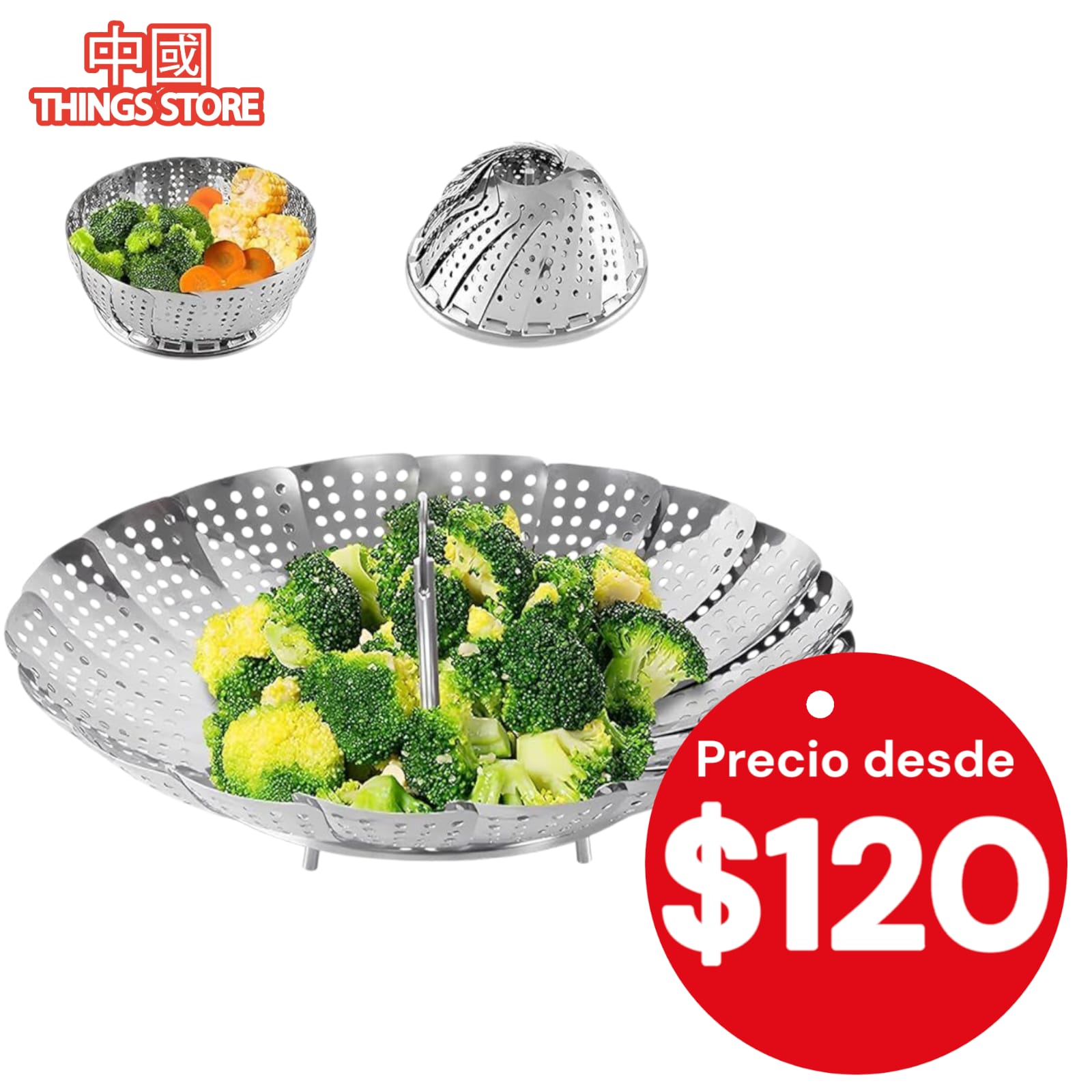 La vaporera Verduras es una cesta de vapor para verduras plegable, fabricada con acero inoxidable de alta calidad. Cuenta con un mango extraíble de plástico sin BPA de grado alimenticio y patas antideslizantes de silicona, ideales para ollas de varios tamaños y ollas a presión instantánea.